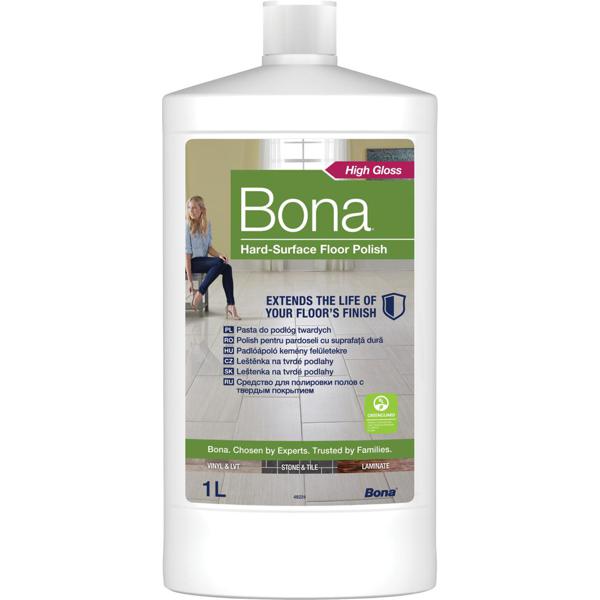 Bona Leštěnka na tvrdé podlahy je určena k údržbě tvrdých podlahovin – laminátu, vinylu, linolea, dlaždic bez glazury (keramických, kamenných), kamene a mramoru. Dodává podlaze nový lesklý vzhled a zároveň zajišťuje ochranu před opotřebením. Lesklý přípravek připravený k okamžitému použití.